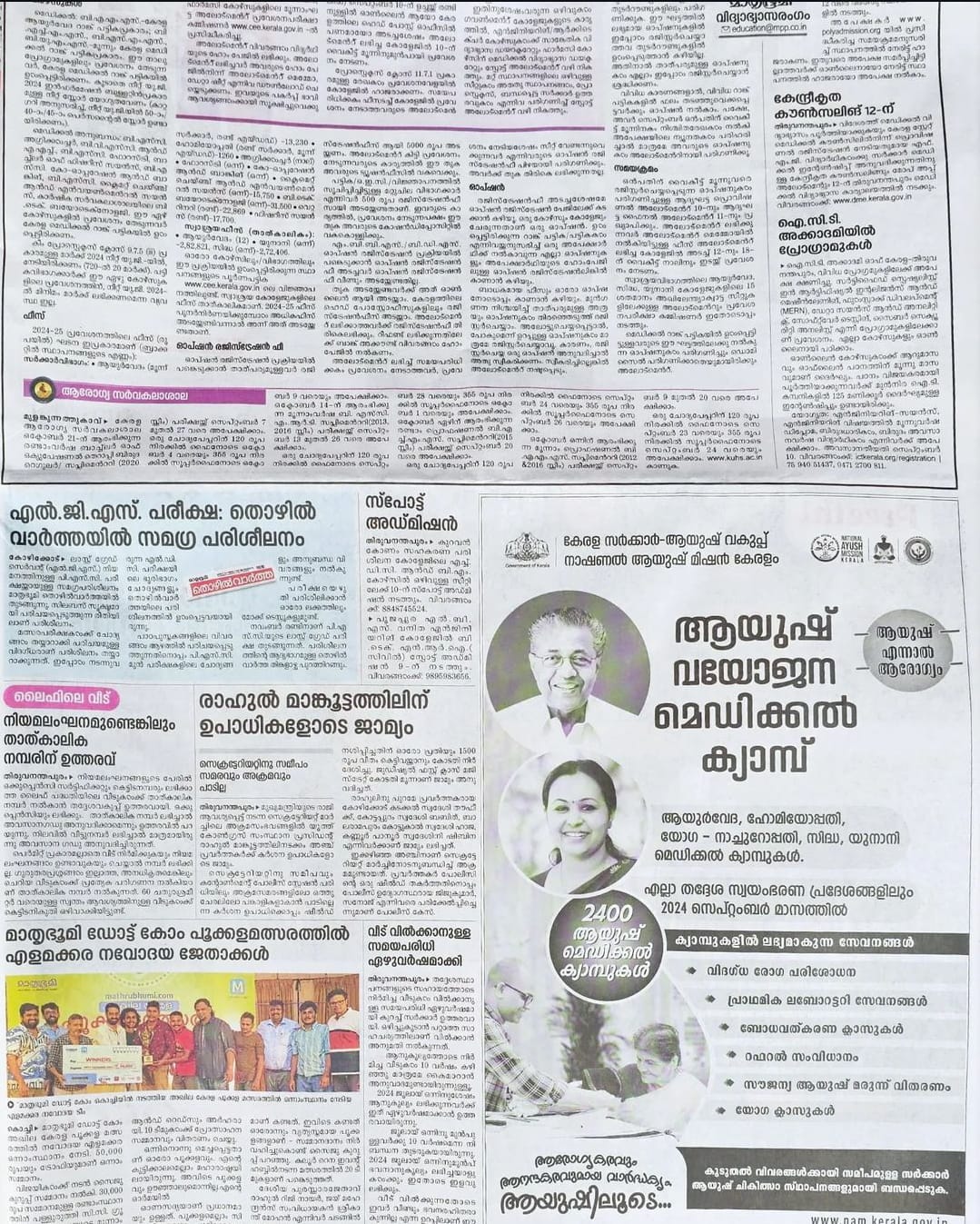 AYUSH Geriatric Medical Camps advertisement featured in all Kerala editions of Mathrubhumi and Desabhimani newspapers on 08.09.2024 AYUSH Geriatric Medical Camps, a National AYUSH Mission, Dept of ISM & Dept of Homoeopathy initiative in all Local Self Governments. Progressing successfully under the leadership of 2400 AYUSH Govt health facilities across Kerala.