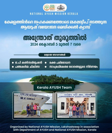 AYUSH Geriatric Medical Camps being conducted at Lakshadweep in Androth Islands from October 5 to October 7, 2024 organised by National AYUSH Mission, Lakshadweep in association with Dept. of AYUSH and National AYUSH Mission, Kerala.
