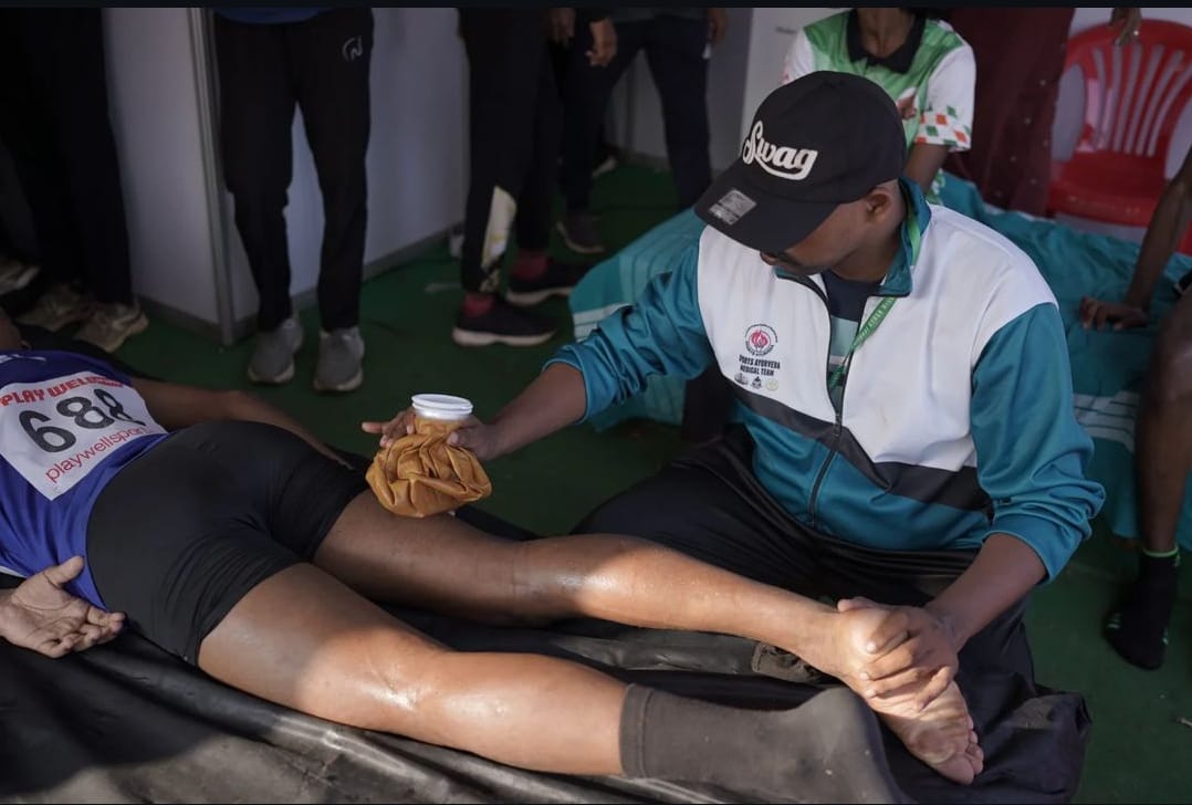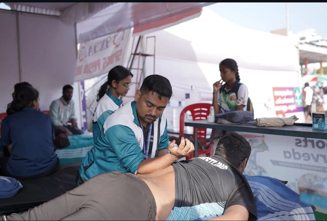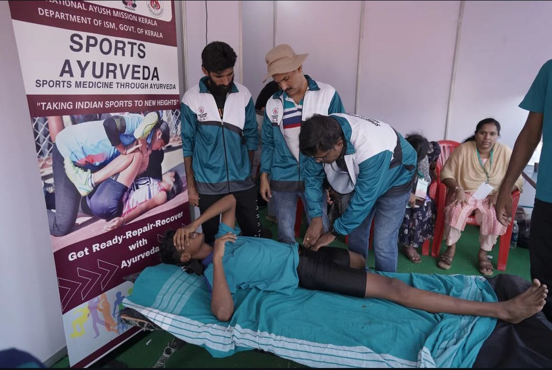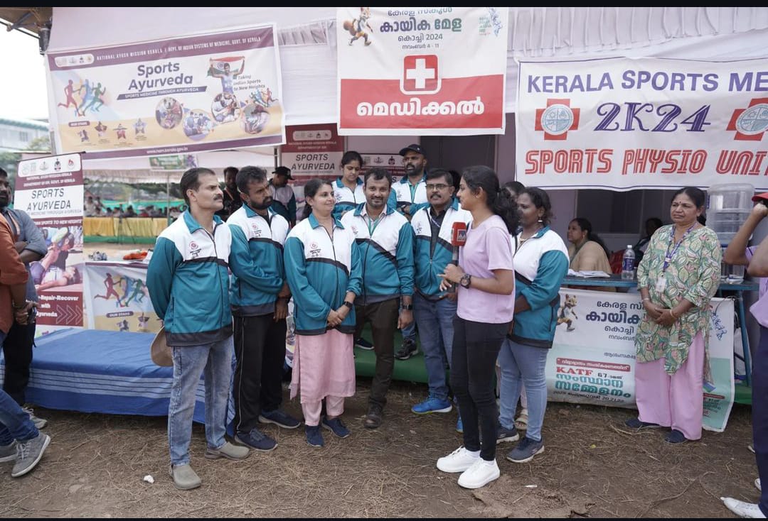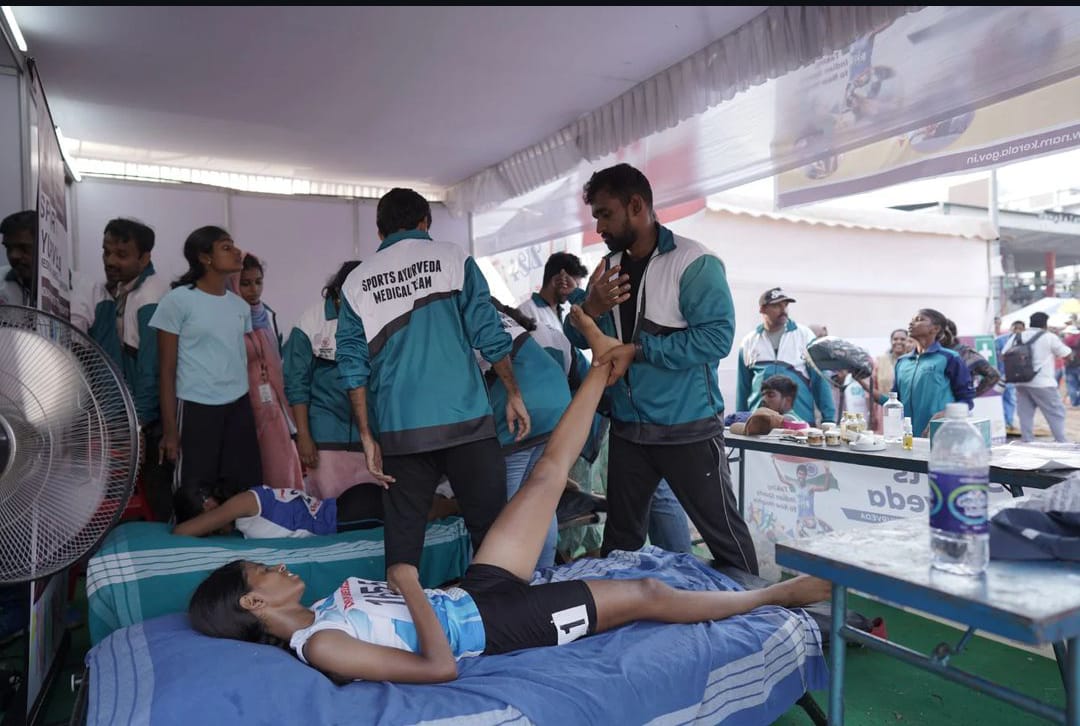 A full-fledged Sports Ayurveda Medical team at all 17 venues of Kerala School Sports Meet 2024 catering to the medical needs of the athletes who behold the future of the nation. The team comprising Specialist medical officers, Medical officers, Nurses, Attenders, physiotherapists etc. have already attended 1500+ athletes from the commencement of the event. Sports Ayurveda is a project run by National AYUSH Mission for treating sports related injuries through Ayurveda under the leadership of KISAR ( Kerala Institute of Sports Ayurveda and Research) under the Department of ISM.
